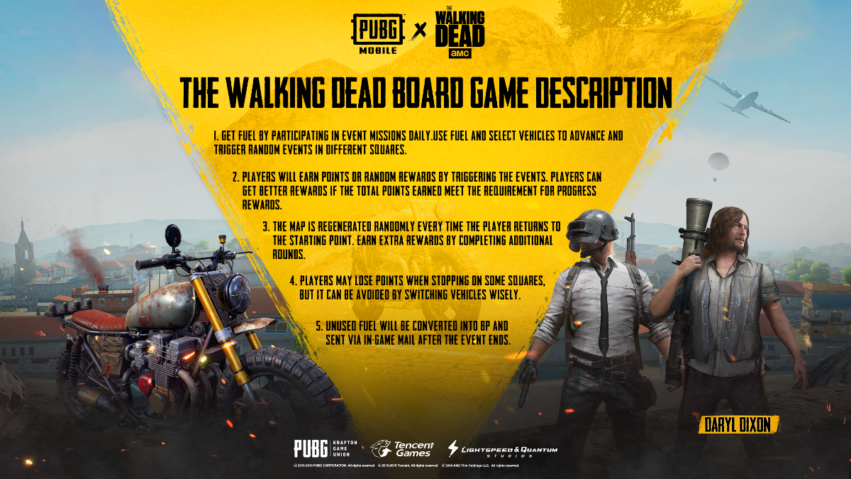 This Walking Dead event is an actual board game in PUBG MOBILE. Unlock Daryls Motorcycle and enter to win an iPhone 11. Recently character skins weapons and vehicles from AMCs The Walking Dead were added for fans in PUBG Mobile.